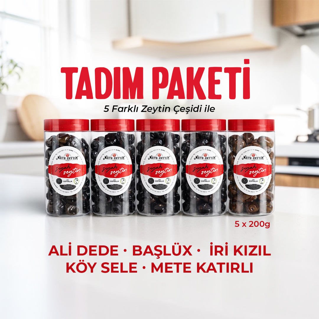 En sevilen 5 farklı lezzetimizi, 200 gramlık özel paketlerde bir araya getirdik. Sofralarımızın en seçkin Gemlik ve köy zeytinlerinden oluşan bu 1 kg’lık Tadım Paketi ile hem damak tadınıza en uygun zeytini bulabilir hem de sofranıza çeşitlilik katabilirsiniz.